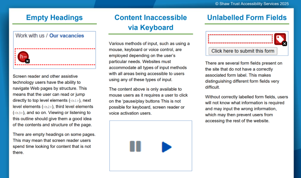 If you’re looking to identify gaps or weave accessibility throughout your design process, Shaw Trust’s Accessibility Services can help with both consultancy and training. If you’d like your website checked for accessibility issues, please visit our website for a free ‘snapshot’. Alternatively, for more information please contact Accessibility-Services@Shaw-Trust.org.uk.